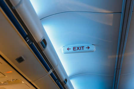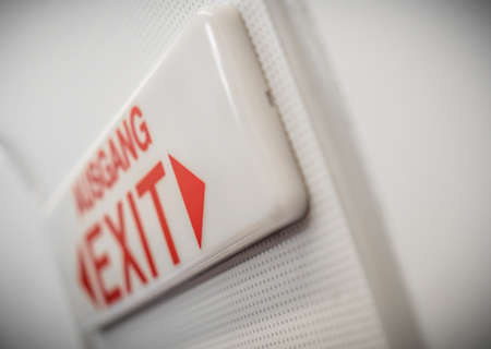NIZHNY NOVGOROD, RUSSIA - CIRCA JULY, 2018: close up shot of exit sign in Strigino International Airport.