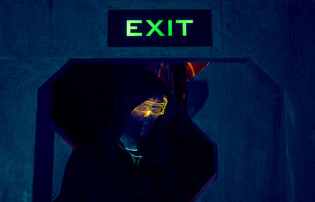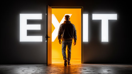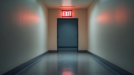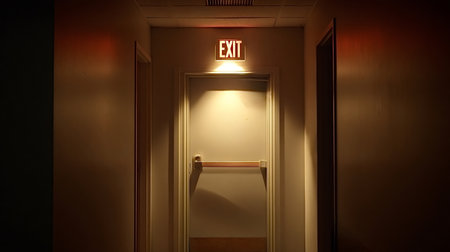 The Exit sign glowing in red shows the word EXIT to doorway. Generative AI..