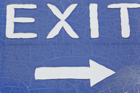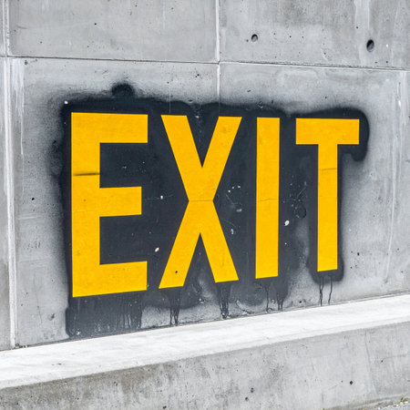 In a stark, industrial setting, a bold yellow 'EXIT' sign is stenciled onto a heavy concrete door. The dripping paint suggests urgency and a raw, unfiltered path forward.