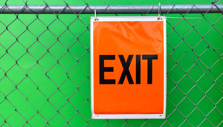 A bright orange exit sign hangs against a vibrant green chain-link fence, offering a clear and simple direction.