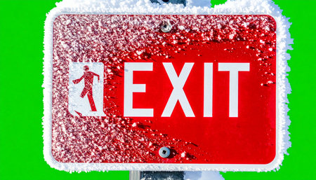 A red exit sign, encrusted with sparkling frost and snow, stands starkly against a vibrant green screen background.