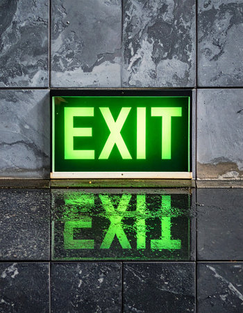 A brightly illuminated green exit sign glows against a dark, polished stone facade, its reflection shimmering on the surface below.