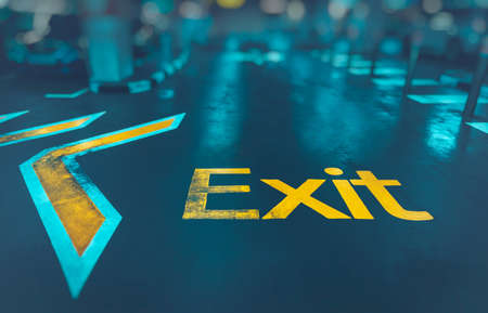 Exit background, big yellow arrow to exit from subway, direction sign, conceptual imahe of the way out, urban life, modern underground system