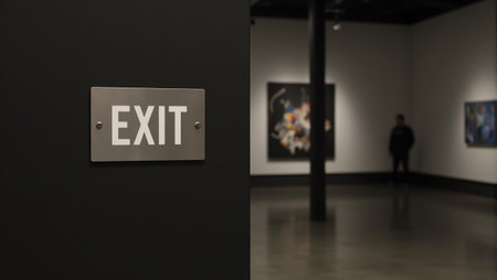 Modern art gallery with illuminated Exit sign on polished concrete floor