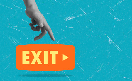 A hand reaches out to touch an orange exit button that is prominently displayed against a vibrant blue background, suggesting a digital interaction or navigation.