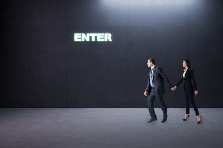 Thoughtful young businesspeople standing in concrete interior with entrance to success. Way and opportunity concept