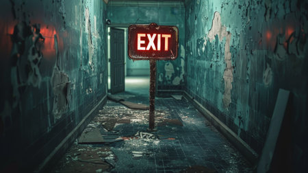 An eerie red exit sign glows ominously in a dilapidated corridor, highlighting the desolation of an abandoned building.