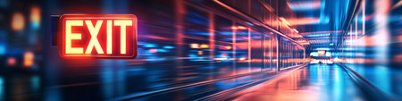 Neon Exit Signage in Urban Corridor Showing Emergency Evacuation Route in Modern Design