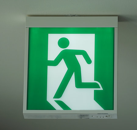 Fire exit light sign. Green emergency exit sign showing the way to escape.