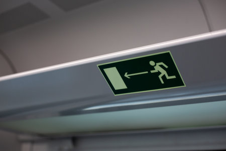 Emergency exit sign in train, can be effectively used in project related to news on accidents. Sign symbolizes safety, rescue and path to safety, concept emphasizing emergency procedures