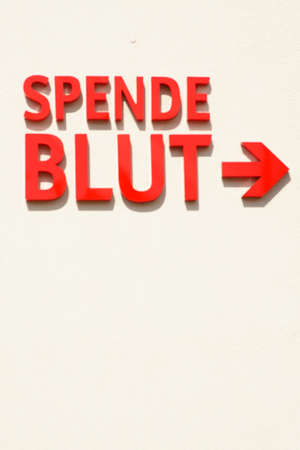 The call donate blood in red letters and with directional arrow on a bright wall.