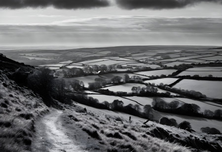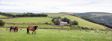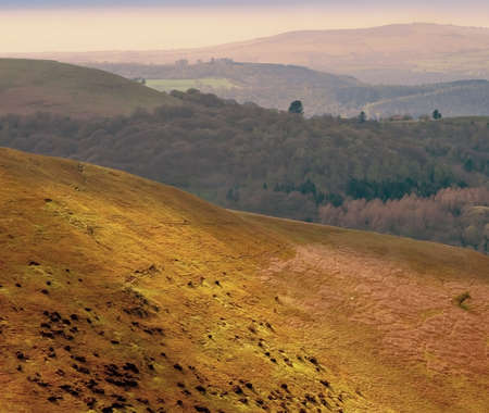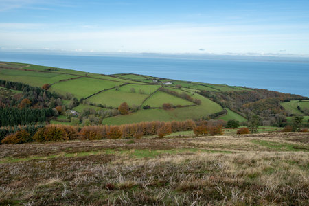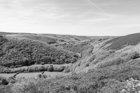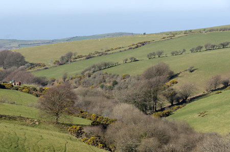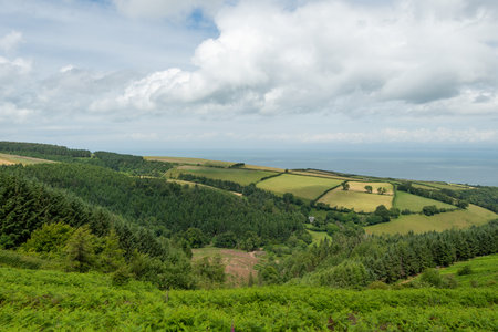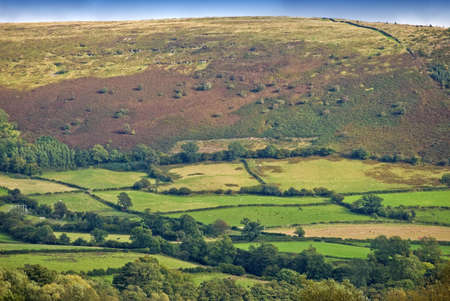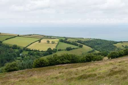 Rolling hills and farmland in Exmoor National Park, North Devon. Panoramic view from the hill.