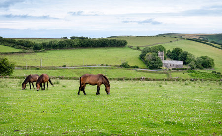 three brown horses graze in green grassy summer meadow with very old church in the background in english national park exmoor