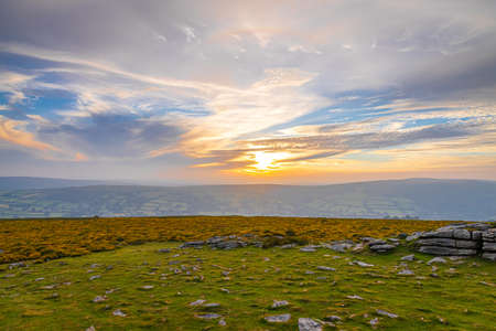 Sunset view of Dartmoor National Park, a vast moorland in the county of Devon, in southwest England, UK