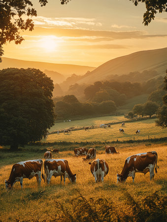 Guernsey cows grazing peacefully in a golden meadow as the sun sets over the rolling hills of the english countryside