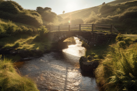 a bridge that cuts across a valley, with the sun shining on the water, created with generative ai