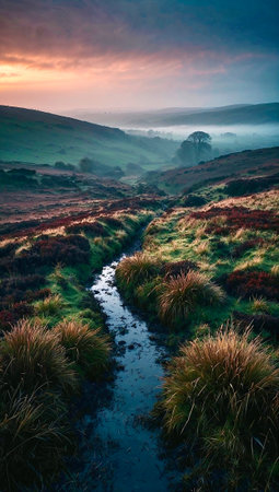 Early morning sunrise over a small stream flowing through the Derbyshire countryside