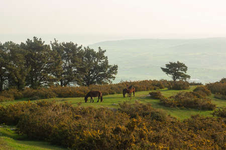 some wild ponies stood on top of Porlock Hill, Somerset, England