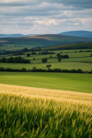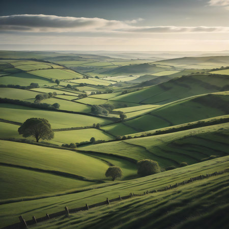 a traditional british landscape featuring fields, trees, and a plowed field. the photo showcases spectacular backdrops and is captured using the tamron sp 70-200mm f/2.8 di vc usd g2 lens. the colors of green and brown dominate the scene, with free-flowing lines adding a sense of movement. the composition is landscape-focused, reminiscent of the art of kintsugi. ai generated