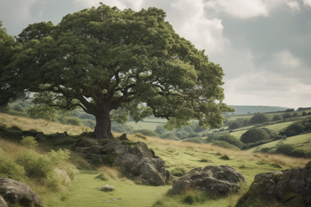 Panoramic aerial view of a lone tree on a hillside in the Peak District National Park, UK