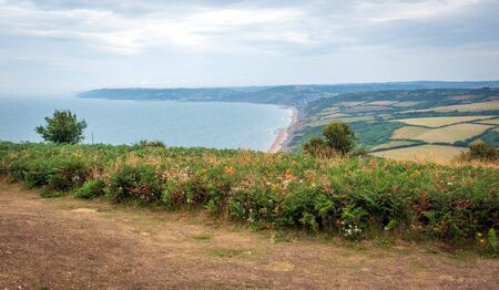 Green fields on a hill with the sea English Channel and English countryside in the background. Golden Cap on jurassic coast in Dorset, UK. Photo with selective focus. Bright summer holidays photo.