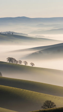 Gentle rolling hills are shrouded in soft mist, with layers of valleys receding into the distance under a pale sky.