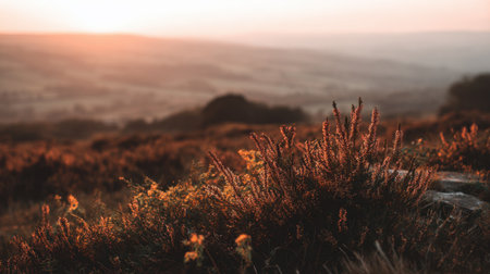 A breathtaking sunset paints the sky with warm hues over rolling hills filled with golden heather. The peaceful landscape offers a serene escape into nature's beauty.