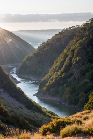 A serene valley unfolds with a gently curving river flowing through, enveloped in mist. Lush greenery surrounds the water, creating a peaceful and picturesque scene.