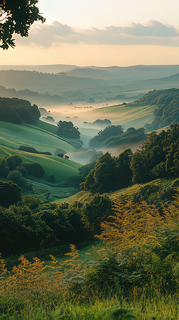 A captivating landscape showcasing gentle sunlight streaming through rolling hills and trees, creating a serene and tranquil atmosphere in a picturesque countryside setting.
