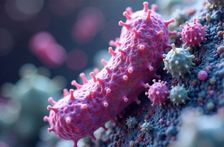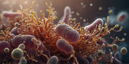 Close-up view of bacteria in a vibrant microscopic world, showcasing intricate details and colorful structures.