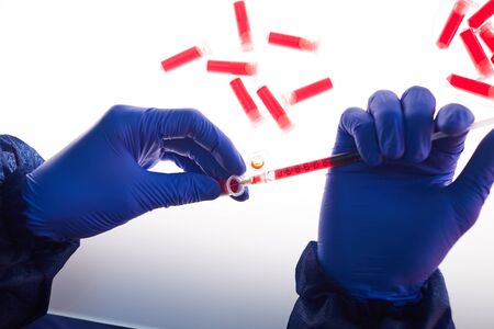 Close up of a doctor wearing blue gloves holding a syringe with his hands, taking a sample of red liquid from a round plastic container with a group of round red clinical sample in the background