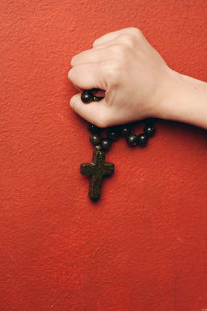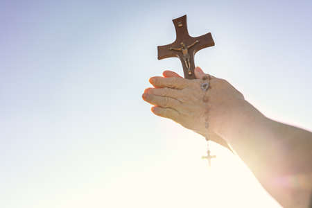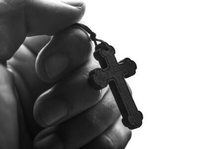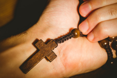 The crucifix is in the hands of a man who is praying for the blessing of his god with faith.