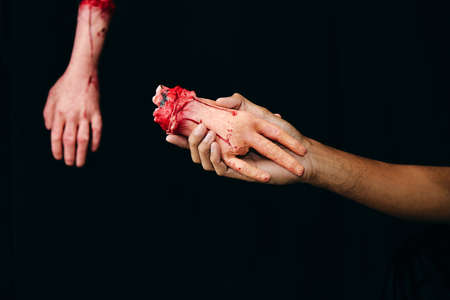 Close up of Necromancer handshake with zombie hand on black background in Halloween concept