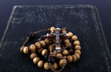 Rosary beads and prayer book. Rosary and book of Catholic Church liturgy on dark background.
