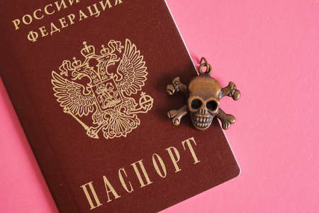 passport of a citizen of the russian federation and a keychain in the form of a skull and crossbones on a pink background, war in ukraine concept