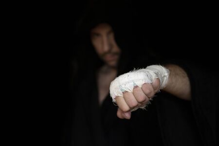 Pro caucasian fighter in hood shows punch gesture with one taping hand before rumble, low key, selected focus. Sport, boxing, single combat, training, power, punch, battle and preparation concept