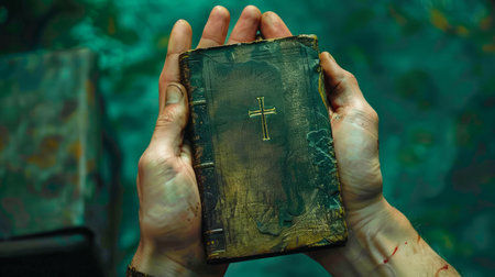 Mysterious Ancient Book with Cross Emblem Held in Hands Against Dark Enigmatic Background AI Generative