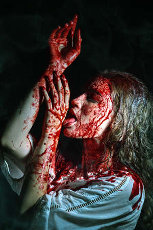 Spooky portrait of a girl drenched in blood standing in a dark gloomy castle licking blood from her body. Horror, thriller. Halloween. Vampires.