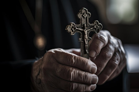 Church priest holds religious cross in hands, close up. Prayer in church. Concept of faith in God. Created with Generative AI