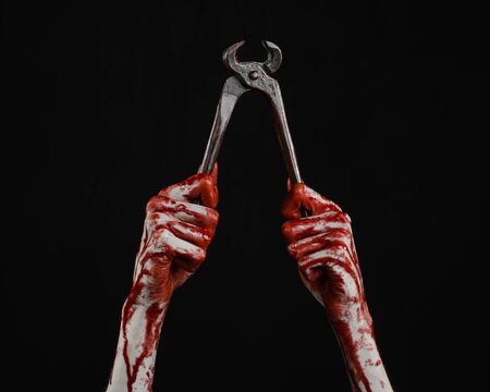 Halloween theme: bloody hand holding a pliers on a black background studio