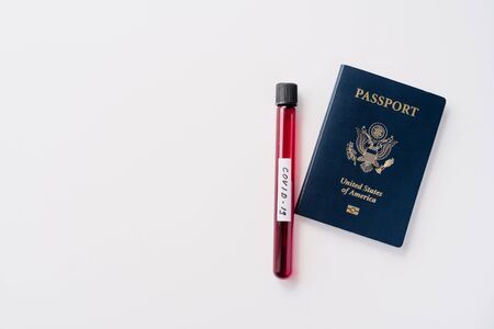 Travel restrictions, quarantine and coronavirus concept. Blood sample in tube and passport on white background. Gloabl pandemic outbreak. Airport security check