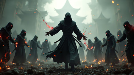Group of mysterious people wearing hooded cloaks emerging from a thick fog at night. Ai generated image