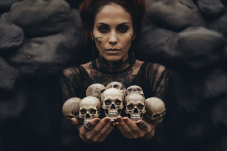 a witch holds in hands the skull of a demon. Halloween, a young woman at the carnival like a witch,