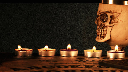 Creepy Scary Skull on a Witchcraft Ouija Board and Candles