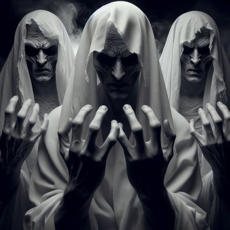 Striking image of four mysterious figures draped in white robes, with dark, textured faces emerging from shadows.. AI Generation