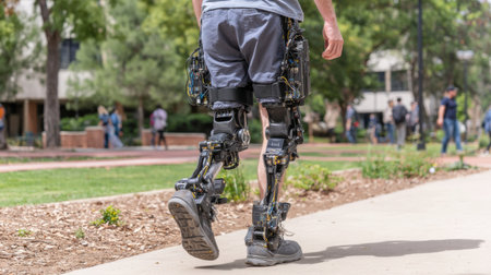 Bionic leg prosthetic limb robotic joint metal frame athletic shoe pavement urban walking mobility technology human lower body cybernetic