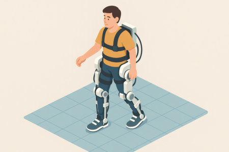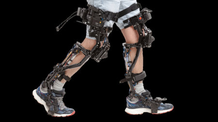 Using a robotic exoskeleton for mobility assistance testing, with a focus on the joints and mechanical parts interacting with the human body. Generative AI
