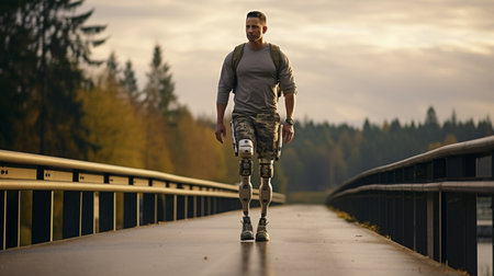 Man with bionic prosthetic legs walking confidently along an urban pathway, embodying resilience, independence and modern technology in active everyday life