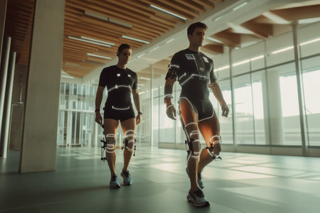 In a high tech lab engineers are testing a robotic exoskeleton suit focusing on its potential to boost human capabilities and performance during various activities.