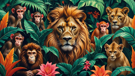 lion and monkey in tropical jungle with leaves and flowers. illustration